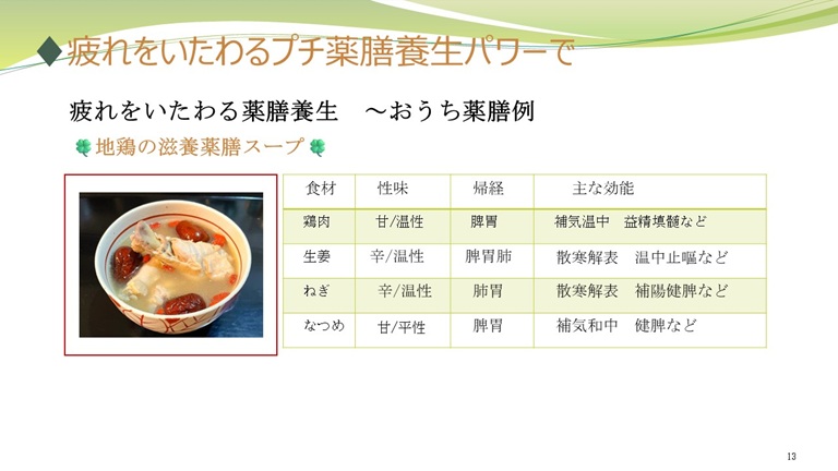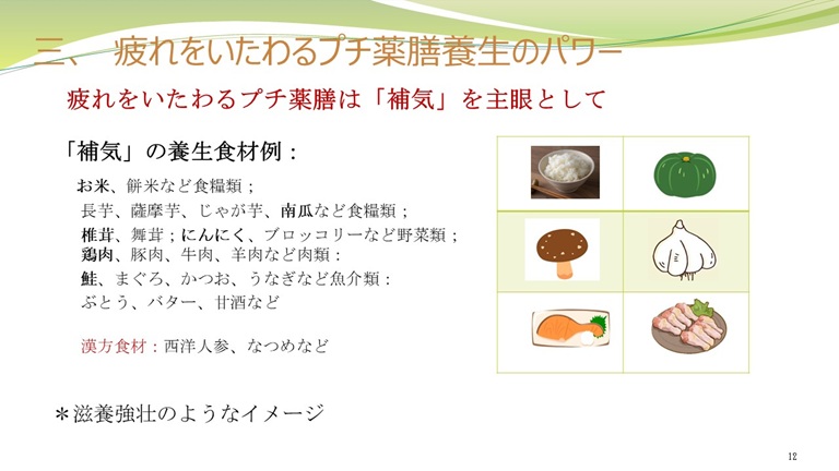普段、おうちでも手に入る疲れをいたわる薬膳養生の食材例も紹介.