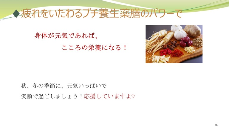 また、薬膳養生も不定愁訴やこころの健康に役たつことは大変光栄に存じます。