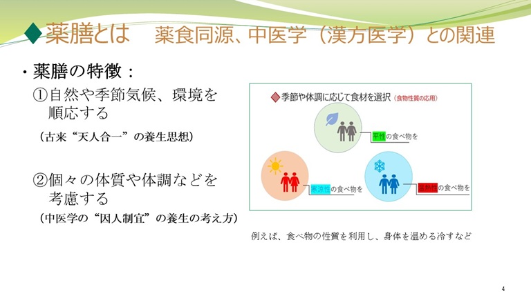 薬膳養生の特徴である天人合一の養生思想や体質に応じる養生を最初に紹介。